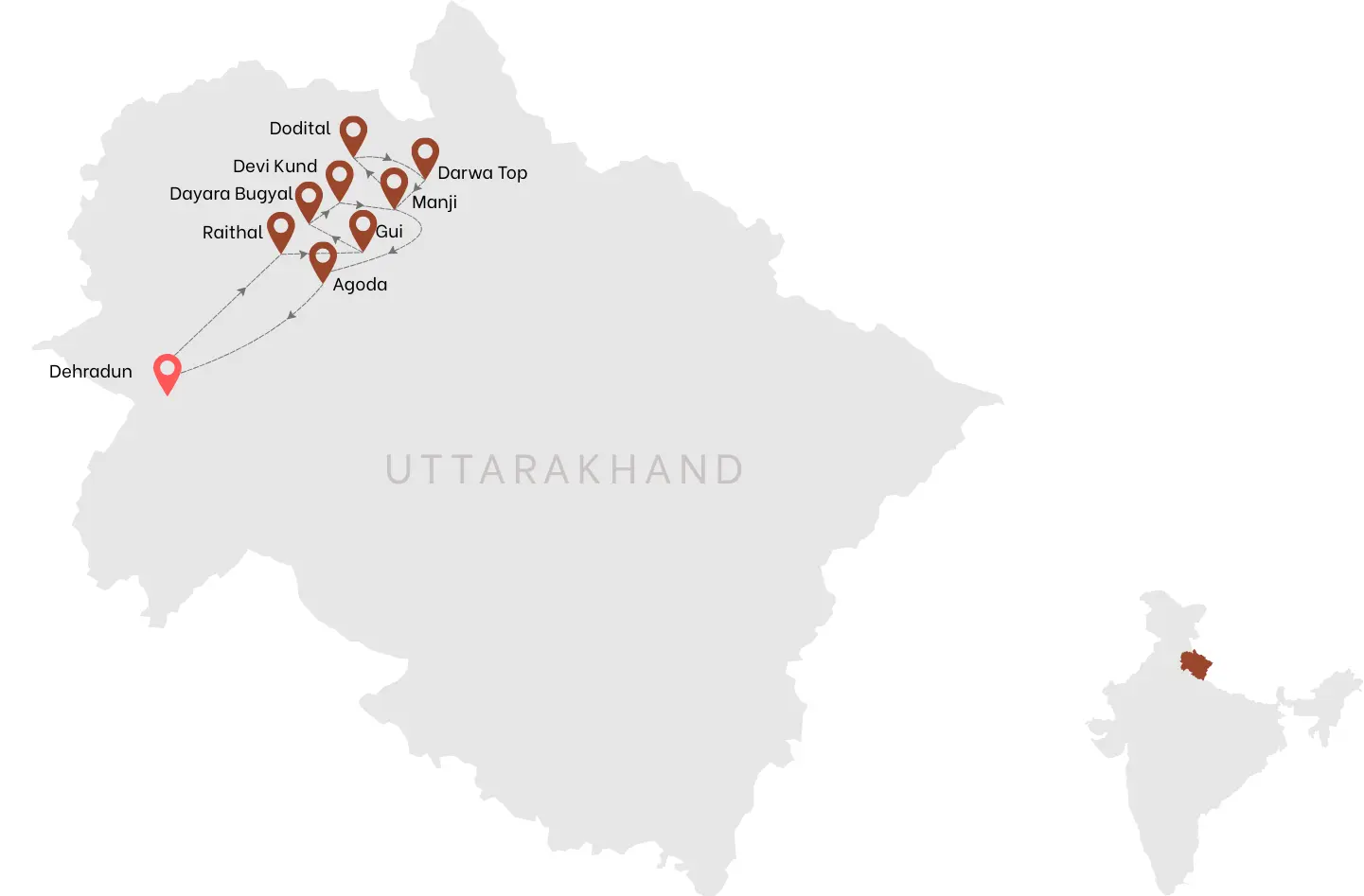 The final day involves a quick and continuous downhill trek to Agora village, marking the end of the walking portion of your adventure. The path is well-worn and enjoyable as you descend to lower altitudes. From Agora, you will board your pre-arranged vehicle for the road trip back to Dehradun.