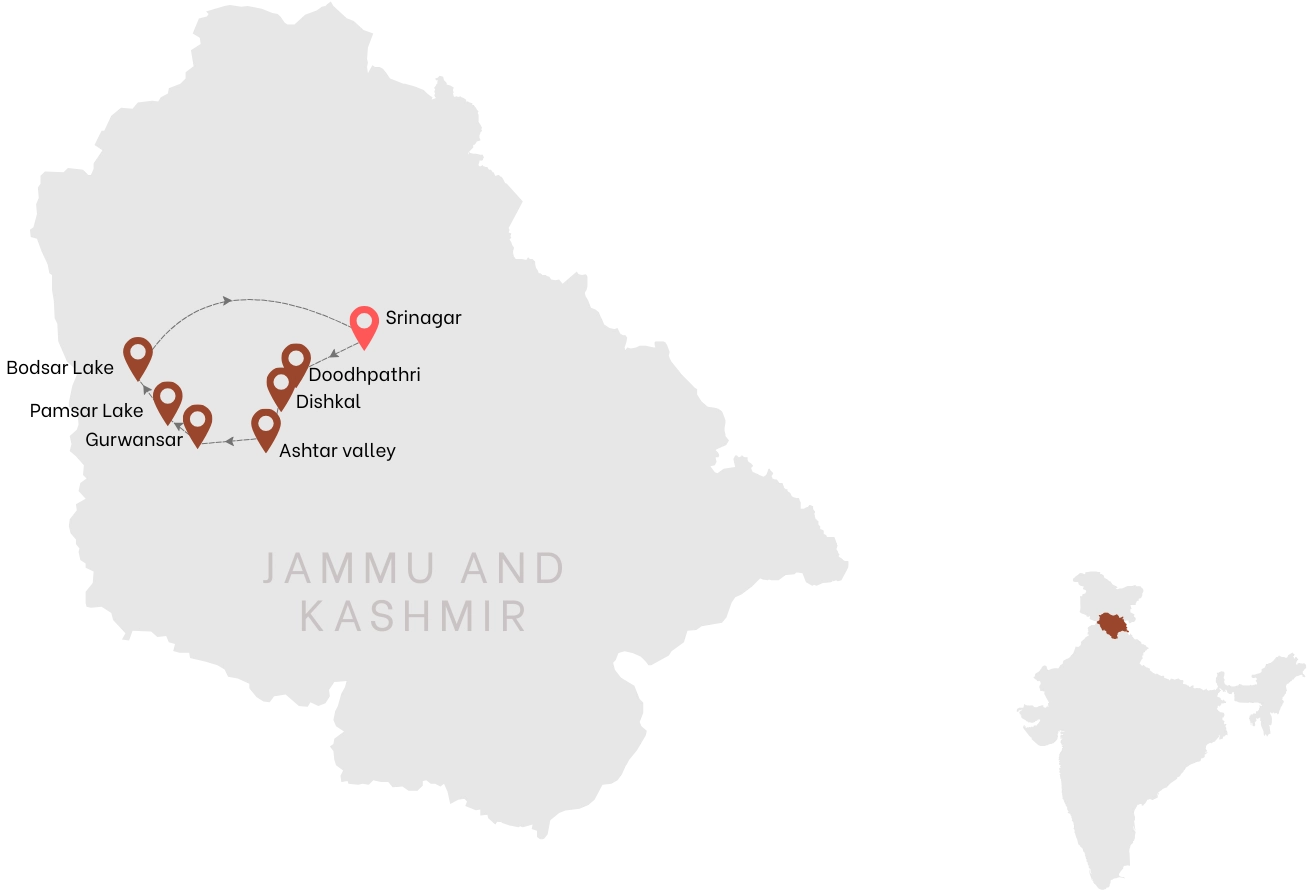 The Doodpathri trek is a hidden gem in the heart of Kashmir, offering an offbeat alternative to the more crowded Himalayan trails. This trek takes you through the pristine wilderness of the Pir Panjal range, where vast, undulating meadows like Dishkal and Ashtar rival the beauty of Gulmarg. In summer, the trail is a vibrant display of emerald-green pastures and wildflower-strewn valleys, following the Shailganga River to its glacial source. You will encounter seven majestic alpine lakes, including the turquoise Bodsar and Pamsar, while camping in remote valleys that feel untouched by time, eventually concluding your journey in the legendary, expansive grasslands of Tosamaidan.