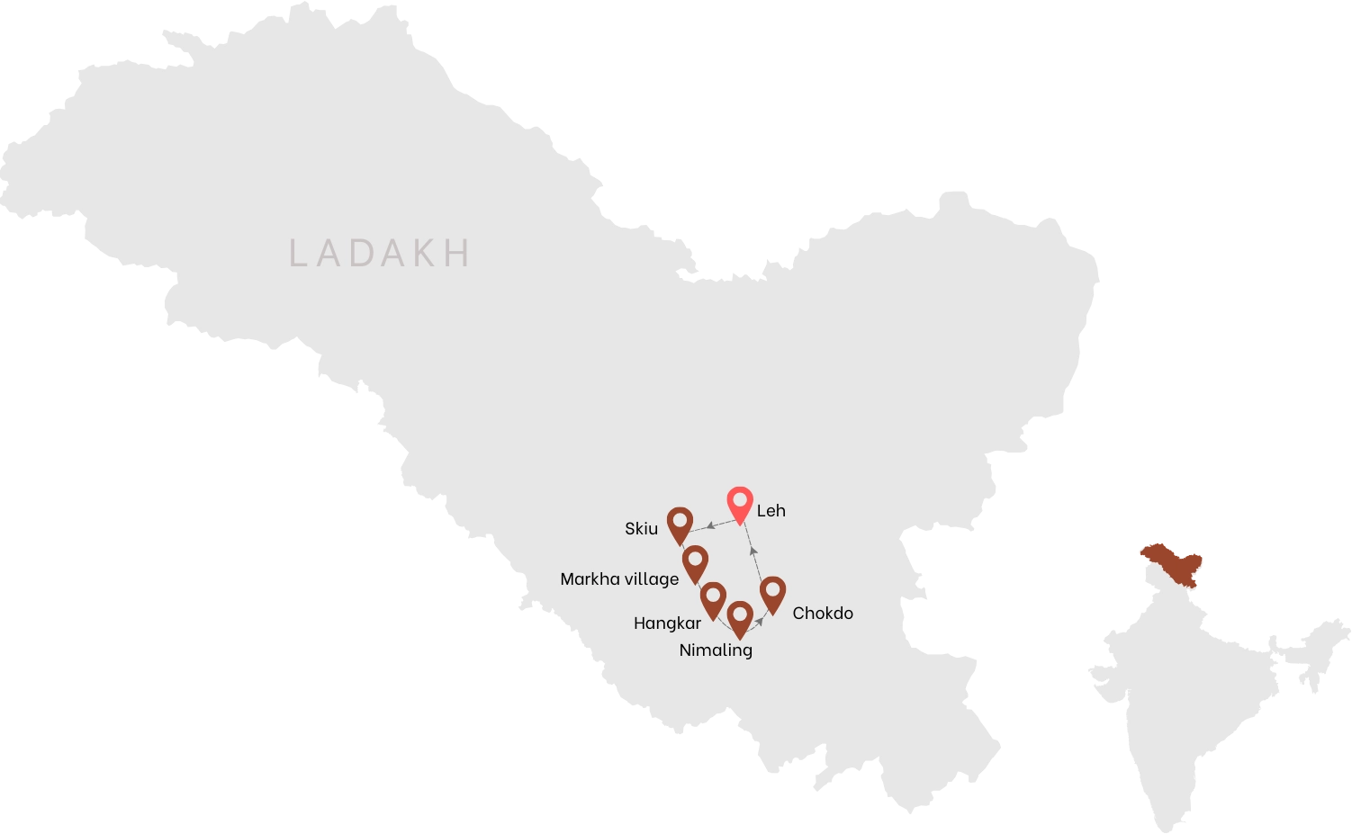 If you had to pick just one trek that showcased the beauty of one of the most stunning regions of the Indian Himalaya, Markha valley is the answer. Located in Hemis National Park in one of the northernmost frontiers of India, the union territory of Ladakh, this journey takes you through a dramatic high-altitude desert, offering river crossings, views of the stunning Kang Yatse, and an ultimate climb over the 17,060 ft Kongmaru La pass. The trail features striking canyons, wildlife, and welcoming village homestays, making it one of the few teahouse treks in India, and a truly rewarding adventure. Other than the physical beauty of the landscape, this trip also touches on the surface of the rich cultural heritage of the region through its monasteries, architecture, people, and cuisine.